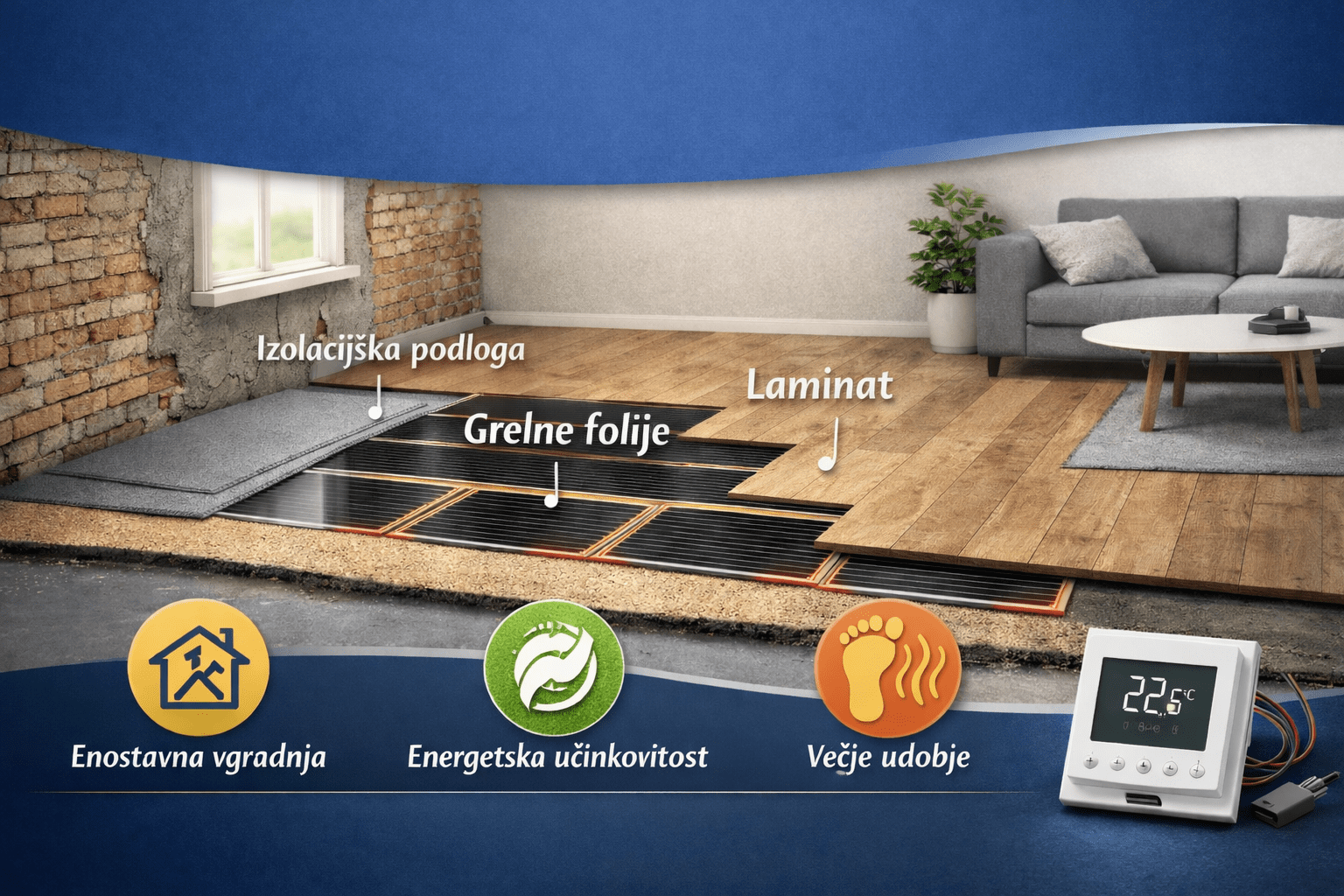 Pri prenovi dnevne sobe velike približno 25 m² se najprej odstrani stari laminat in pripravi podlaga. Nato se položi izolacija in grelne folije na približno 18–20 m² ogrevalne površine. Sistem se poveže s pametnim termostatom, na koncu pa se namesti nova talna obloga.